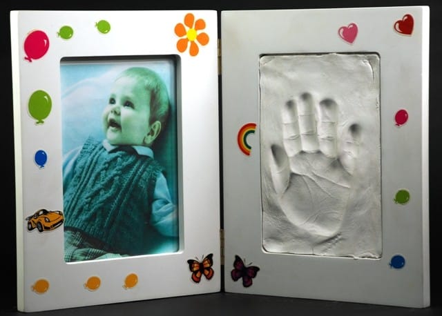 מסגרת לתמונה (בצדו האחד) משולב עם הטבעת כף יד/רגל של ילד/תינוק בחמר (בצידו השני של המסגרת)