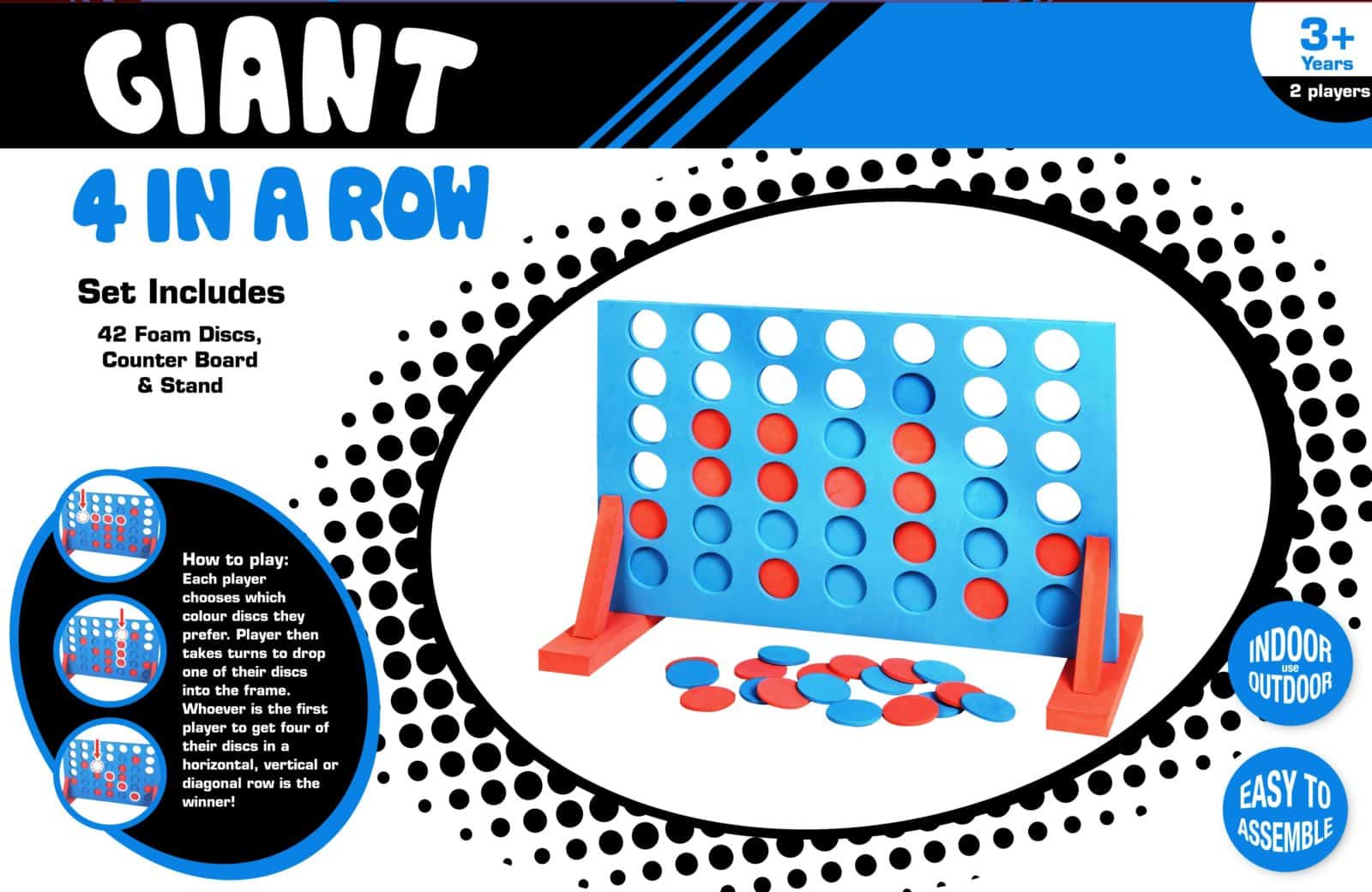 המשחק כולל: 42 דיסקיות עגולות בצבעים כחול/אדום + לוח בצבע כחול  + רגליים להעמדת הלוח בצבע אדום