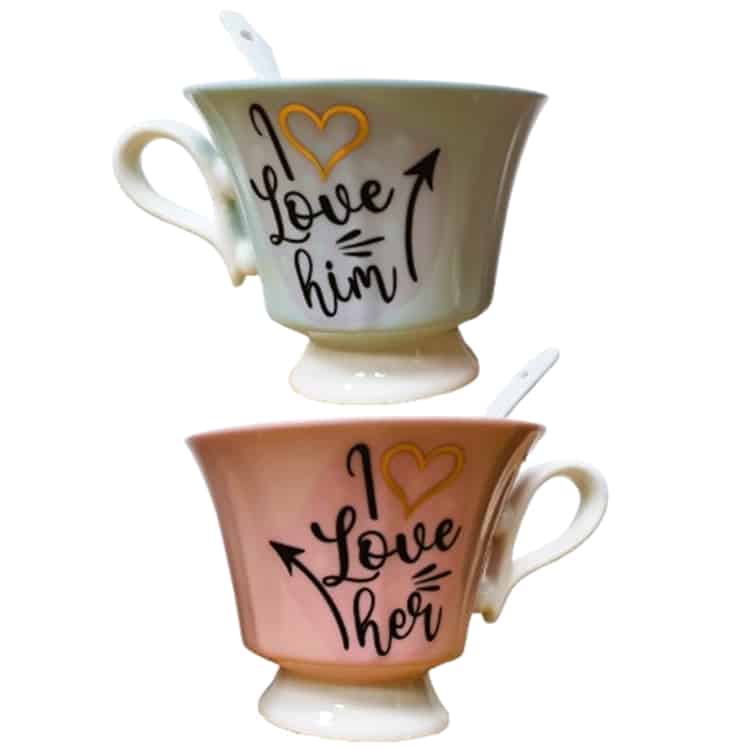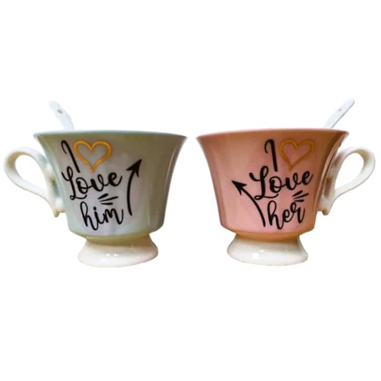 2 ספלים מעוצבים – אחד עם הכיתוב I love him, והשני עם I love her