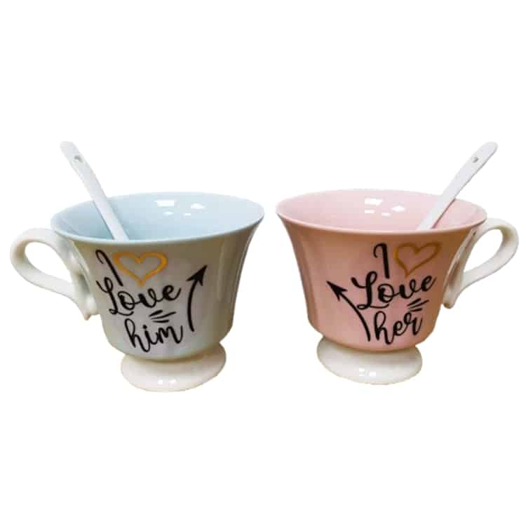 סט 2 ספלים לזוגות I love him/her – עם כפיות