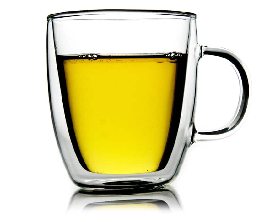 כוס מאג טרמית עם ידית, בעלת דופן זכוכית כפולה, כך שדופן הכוס אינה חמה.