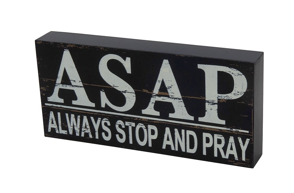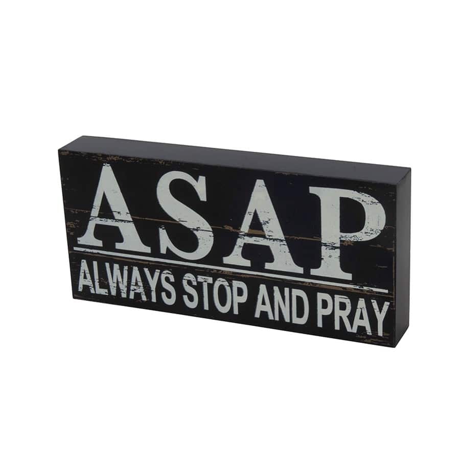 שלט מעוצב מלבני מעץ, עם כיתוב ASAP – ALWAYS STOP AND PRAY